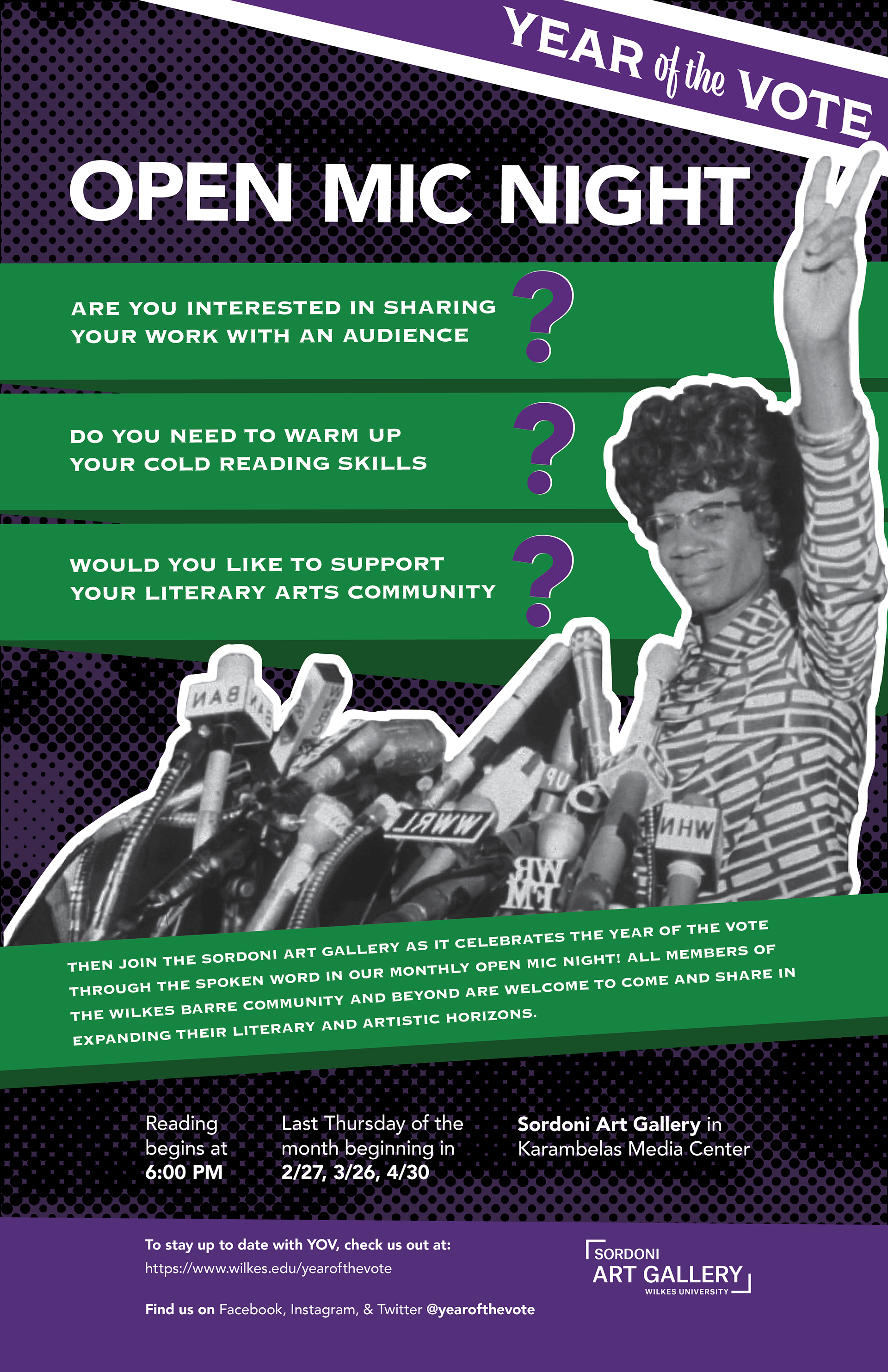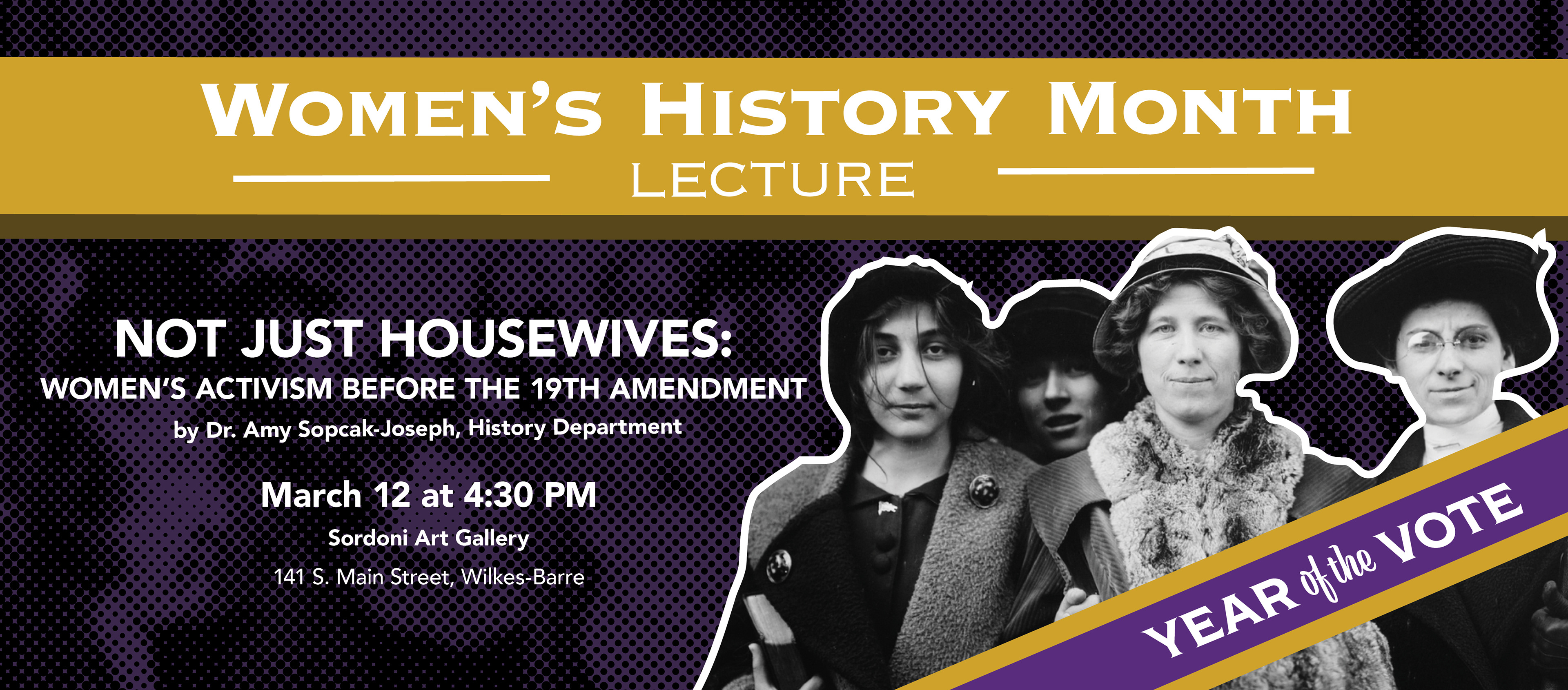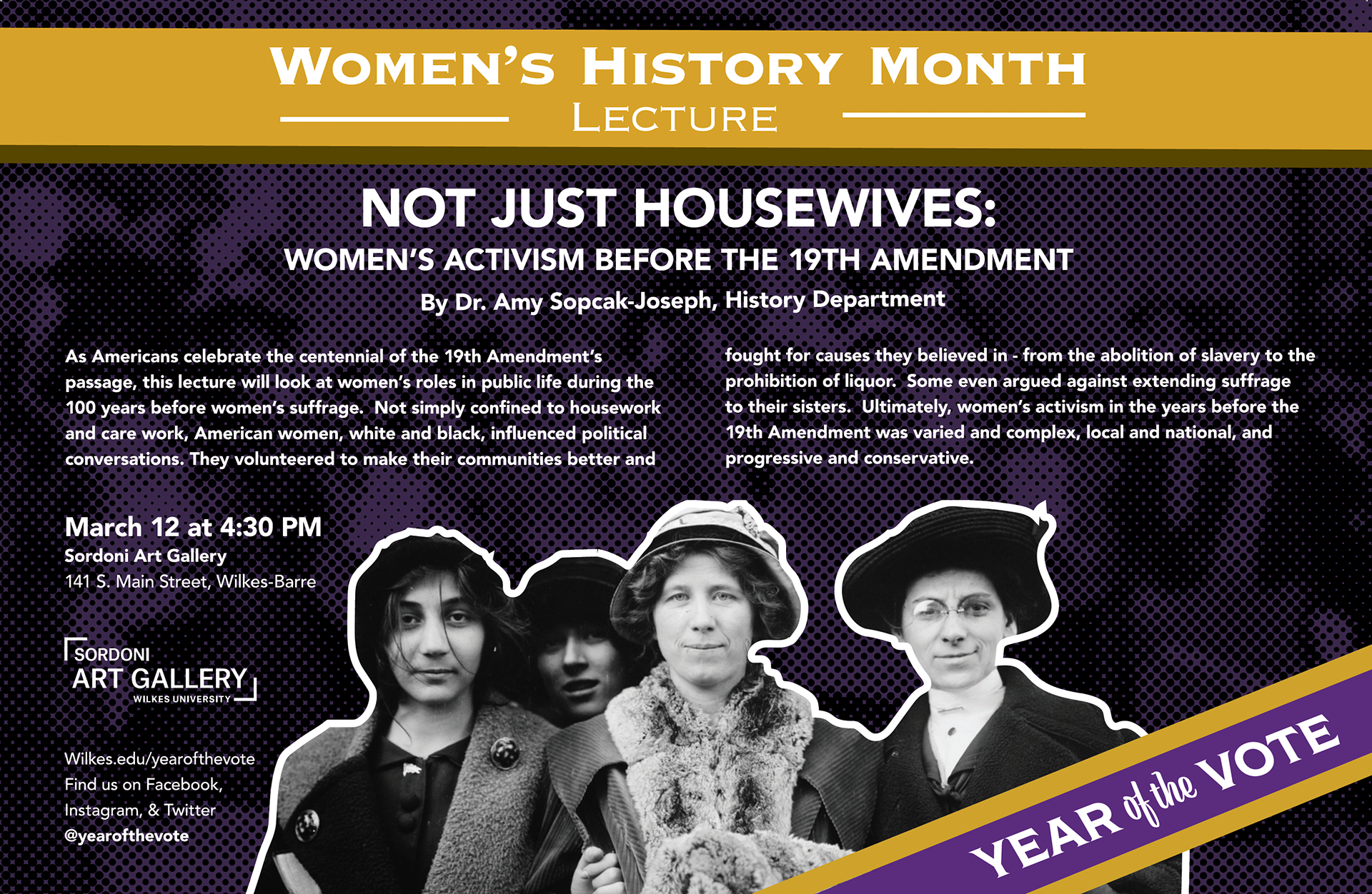 100th year anniversary of Women's Suffrage!!! The Year of the Vote is a collaborative interdisciplinary project of the Wilkes University faculty representing the departments of Women & Gender Studies, English, Integrative Media, Psychology, Political Science, History, and Nursing. The main goal is to educate our community about the achievements of women while also empowering students to engage with their community throughout this whole year. My job is to create posters and banner for social media to promote the events realized this year.